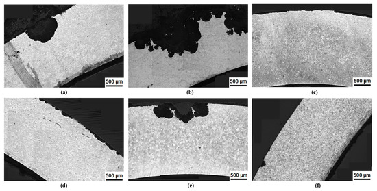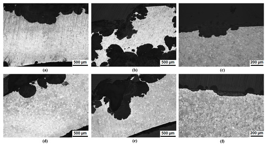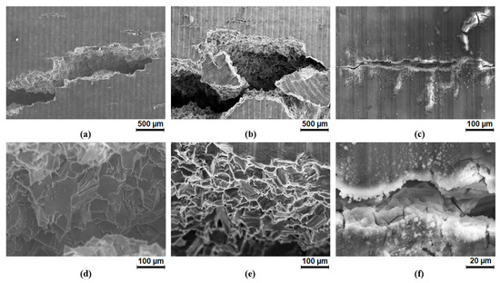 Figure 6 shows representative micrographs of the C-rings after stress corrosion for over 20 days. It can be seen very clearly that the Mg10Dy alloy (Figure 6b,e) corroded the most and very severely on the tension and compression sides on both sides of the ring. Whereas the Mg10Dy1Nd alloy (Figure 6a,d) forms elliptical and semicircular pits (slightly subsurface) that started overlapping and the Mg10Dy alloy (Figure 6b,e) forms subsurface-undercutting pits. The corrosion of the Mg1Nd alloy after 20 days also increased; however, the number of pits was far less than that in the Dy-containing alloys, and the subsurface pits were not very deep and were rather wide. In agreement to the discussion above, the pits were formed, where the accumulation of corrosion product were found. The formation of these wide and shallow corrosion pits did not cause a significant stress increase when mechanical loading was applied. Because of the severe corrosion on the Mg10Dy alloy and the overlapped on both sides after 20 days, it was not possible to determine the pitting factor. The Mg10Dy1Nd alloy had a pitting factor of 37 and Mg1Nd has a factor of 15. These were very high and unacceptable values. The corrosion morphology, as shown in Figure 5c,d, was acceptable if the pits were not narrow and deep but overlapped to form a wide and shallow corrosion layer.