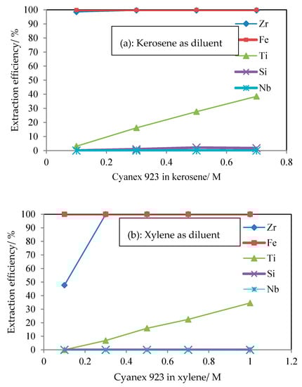 Figure 1 shows the extraction behavior of valuable metals with increasing concentrations of Cyanex 923 in kerosene and xylene as diluent. In both diluents, the Fe and Zr were extracted completely at a low concentration of Cyanex 923, 0.1 M, whereas the Si and Nb were hardly extracted despite an increase of concentration of Cyanex 923. In both diluents, the extraction efficiency of Ti was increased with an increase of concentration of Cyanex 923. Thus, the extraction order of metals by Cyanex 923 was followed by Fe > Zr > Ti> Si and Nb. When comparing the effect of diluents on extraction of Ti, there was only one difference: That Ti was not extracted at 0.1 M Cyanex 923 in xylene. The extraction behavior of valuable metals was similar. However, in the use of kerosene and xylene as diluents, the stripping efficiency was different from the loaded organic phase of organic–metallic species (Table 2). When using 1 M HCl as the stripping solution from the loaded organic phase at different concentrations of Cyanex 923, the stripping concentration of Ti in kerosene as diluent was lower than in xylene. The reason for the differences in stripping efficiency depending on the diluent is that the diluents affected KE (extraction equilibrium constant) in the extraction mechanism of a solvation extractant such as Cyanex 923 due to being the same in all the other conditions. In this study, it was assumed that the species of Ti ion is TiO2+ in the chloride medium aqueous phase [,,,].