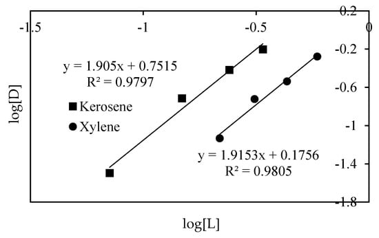 Taking the logarithms of Equation (3), we can obtain Equation (5), by plotting log [D] versus log [L] at constant log [Cl−]. Further, this equation can be expressed as Equation (5).