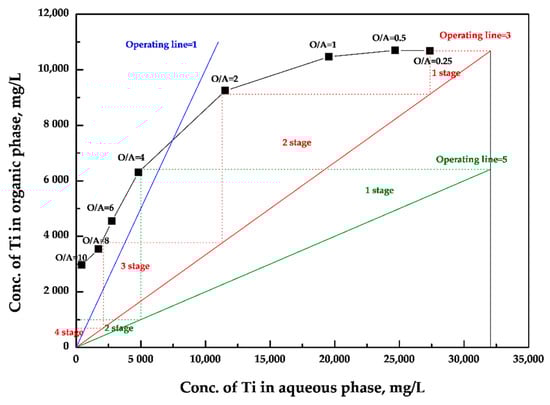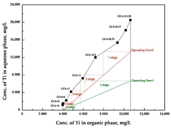 The McCabe–Thiele diagram was drawn for stripping of Ti according to the O/A ratio result in Figure 4. Figure 4 shows that the full amount of Ti could not be stripped and was left in the organic phase at approximately 4000 mg/L using 1 M HCl regardless of the operating line. Through the McCabe–Thiele diagram, it is possible to predict the amount of Ti which can be stripped from each stage. At an O/A ratio of 2, the Ti could be stripped to approximately 14,000 mg/L at the first stage, the Ti could be stripped to approximately 9000 mg/L at the second stage, the Ti could be stripped to approximately 6000 mg/L at the third stage, and the Ti could be stripped to approximately 2000 mg/L at the fourth stage. On the other hand, if the operating line is reduced to 1, the number of stripping stages could be reduced to 2, but the Ti could be recovered to approximately 7000 mg/L at the first stage. Therefore, an operating line of 2 was chosen for recovery of high concentration of Ti. This meant that four-stage stripping was required.