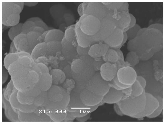 The obtained stripping solution was subjected to hydrolysis treatment for recovery of TiO2. After 12 h hydrolysis, the Ti was precipitated over 98.1%. The obtained precipitate powder was dried at 120 °C for 24 h. The color of the obtained powder was light ivory, not white, due to Cl− in the stripping solution. Therefore, the obtained precipitate powder was washed by distilled water until the pH no longer increased (pH 4.5) from an initial pH of 2.4. The color of the obtained powder was changed from light ivory to white. Then, the washed powder was sintered at a temperature of 700 °C. The recovered powder was analyzed by ICP, XRD, and SEM. Table 6 shows the purities of recovered powder, which contains only 0.03% SiO2 impurity by ICP. Also, the recovered powder is TiO2, which, of phases, was found to be rutile and brookite by XRD analysis (Figure 5), and the morphology of TiO2 had a spherical shape and its diameter was approximately 2 µm according to SEM (Figure 6).