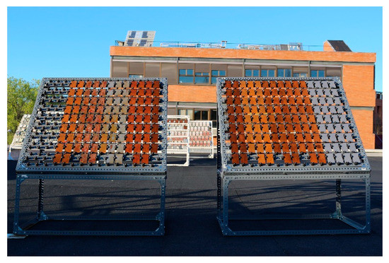 Patinated and non-patinated WS specimens were exposed to the Madrid (Spain) atmosphere on a corrosion rack in March 2017 (Figure 1). The non-patinated WS samples, i.e., bare WS without artificial patina, were exposed to compare the artificial patina of 10% H2SO4 with a natural patina developed without any previous chemical treatment. According to ASTM G50, the rack was placed facing south and at an angle of 45° from the horizontal plane [2]. Batches of five samples were withdrawn after 1 and 2 years of exposure in order to obtain data on mass loss due to corrosion following standard ISO 8407 (3 specimens) and for characterization of the patinas formed (2 specimens). Additional batches were withdrawn at 3 and 6 months to monitor the color changing.