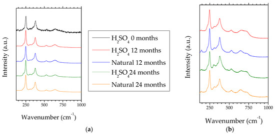 Figure 5a shows representative micro-Raman spectra of the artificial patina (10% H2SO4) and the natural patina formed on WS during its atmospheric exposure in Madrid for two years. Wavenumber shifts and relative intensities of Raman signal peaks correspond to the profile of lepidocrocite (γ-FeOOH) for both patinas, with a more intense and characteristic signal at 250 cm−1 and another signal of less intensity at 380 cm−1 (see second row of Table 3). These signals are narrow and well defined, which indicates a high degree of crystallinity [24] and high concentration of lepidocrocite. However, in some more specific areas of both patinas and regardless of the exposure time, a signal appears at 720 cm−1 as a shoulder of the signal at 650 cm−1 (Figure 5b). It is a non-characteristic lepidocrocite signal that can be associated with other oxidized iron phases such as feroxyhyte (δ-FeOOH), maghemite (γ-Fe2O3) or ferrihydrite (Fe5HO8·4H2O) with Raman signals in the previous wavenumber range (see third, fourth and fifth row of Table 3).