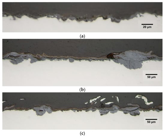 Optical microscope images showing evolution of the cross section of (a) the artificial patina (10% H2SO4) from its initial formation on WS (t = 0) and (b) after 12 months of exposure to the Madrid atmosphere. (c) Natural patina is shown for comparative purposes.