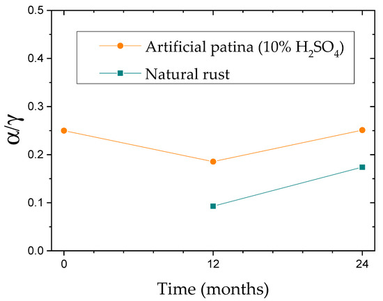 Another alternative is to use protective ability indexes that evaluate how protective a patina formed in the atmosphere is on WS based on its composition determined using XRD. Yamashita et al. [32] found that the corrosion rate of WS exposed to rural and industrial atmospheres decreased as the mass ratio of goethite to lepidocrocite (α/γ) increased. They considered α/γ > 2 to be an indication of obtaining a protective patina after decades of atmospheric exposure [33]. Later, other research groups modified the protective ability index proposed by Yamashita based on the thermodynamic stability of newly identified phases of iron oxides and oxihydroxides. For instance, Dillmann et al. proposed adding the magnetite content to the numerator of the previous index from old rusts and considering this as protective despite the fact that is a conducting phase [34]. Both protective ability indexes were calculated for the artificial and natural patina with respect to the exposure time in the atmosphere of Madrid. However, since the amount of quantified spinel in the different patinas is relatively small, the protective ability indexes were very similar. Hence, Figure 9 shows only the results of the α/γ index. None of the patinas had a goethite content high enough to be greater than twice the lepidocrocite content (α/γ > 2). They need more exposure time to achieve that situation since the corrosion rate of WS has not yet reached the steady state. However, nothing suggests that the artificial patination precludes the above from happening.