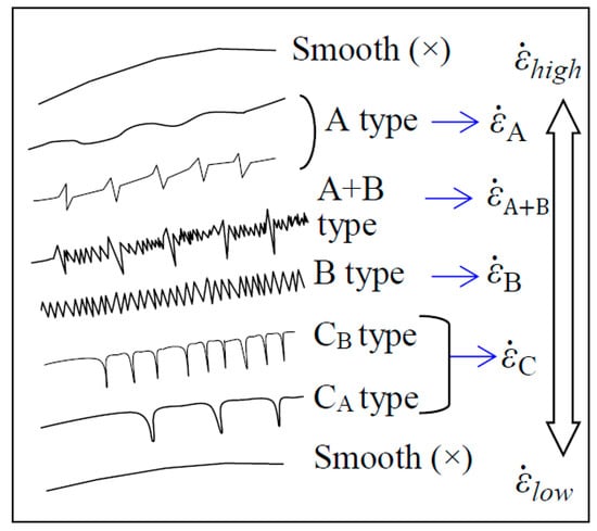 Previous studies have demonstrated that the serration behavior varies with change in the strain rate. The classifications of serrations are briefly summarized below [7]. Figure 1 shows an example of variations in the serration behavior with a change in strain rate [8]. It shows an A-type stress fluctuation that repeatedly rises and falls (the wavy stress fluctuation at a relatively high strain rate, ) and B-type saw-tooth-like stress fluctuations generated at intermediate strain rate (, ). Serrations sometimes occur as a result of a combination of behaviors. For example, an A + B-type—a combination of A and B-type stress—has been reported. The serrations observed at low strain rates () are classified as C-type stress (the CA and CB types depending on the frequency of fluctuation), in which the fluctuations are irregular. At a strain rate above or below , serrations do not occur, rather, a smooth stress–strain relationship is obtained.