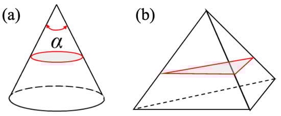 Schematic diagram of a cone-type indenter: (a) conical type and (b) Berkovich (triangular pyramid) type. Here α is the indenter angle and the shaded section is the projection area.