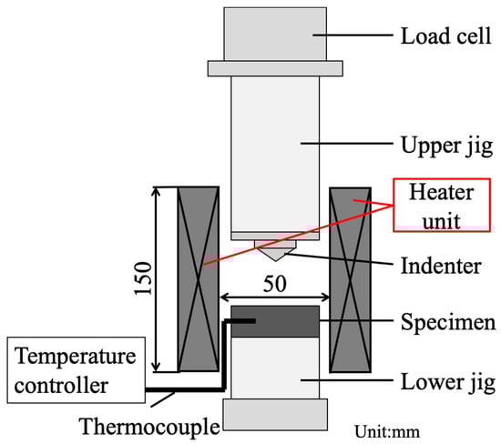 In this study, the temperature at which the Guinier–Preston (GP) zones and the η′ phase precipitate in 7075 alloys was adopted as the testing temperature (described later). First, a temperature of 343 K at which GP zones have been confirmed to precipitate (or nucleate) [20,22] was chosen. The η′ phase has often precipitated under the condition of aging at 393 K for 24 h (T6 temper). In this study, however, a temperature of 443 K at which the η′ phase has been reported to precipitate within a short time (600 to 3600 s) [20] was adopted. Figure 3 shows a schematic diagram of the indentation test at high temperatures. A home-built electric furnace was used. A thermocouple was attached to the specimen surface and was controlled to a predetermined temperature using a temperature controller (CHINO, SY2111, Tokyo, Japan). The arrival times at 343 and 443 K were approximately 1800 and 3600 s, respectively. The specimen was held for 900 s at each of the temperatures, after which indentation was performed. Furthermore, the specimen was held at 77 K in a liquid nitrogen where the low-temperature indentation was performed. At this temperature, aging takes place at a very low rate. Unlike the high-temperature test, the low-temperature indentation test was performed in a container using waterproof paper. The specimen was also indented at room temperature (293 K), thus, the test was performed in four different temperature environments. For each of the temperature conditions, the test preparation was initiated within 300 s of the solution treatment. Therefore, the effect of natural aging was small, except at room temperature.