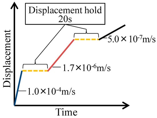 The control methods for indenters can be classified into two: loading rate and displacement rate controls. In this study, a commercial universal testing machine was used, hence, displacement rate control was employed. During indentation, the strain rate was varied by varying the displacement rate (see Figure 4). Previous studies have shown that serrations are being affected by the diffusion of Mg in the solid solution [5]. The time required for Mg atoms in the solid solution to sufficiently pin stagnant dislocations is given by the following equation [23,24]: