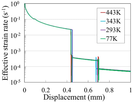 The effective strain rates for the indentations were calculated using Equation (6). Herein, β = 0.1 was used, based on previous studies [8,18]; the effective strain rate–displacement relationship is shown in Figure 6. The effective strain rate under displacement rate control, given by Equation (6), decreased as the displacement increased. The indentations were performed at three different rates by varying the indenter speed (see Figure 4). A wide range of effective strain rates (from 10−4 to 100 s−1) was obtained during the indentations. There was no significant difference in the effective strain rate, even when the testing temperature changed. Aluminum alloys are known to have high strength–strain rate sensitivity at lower temperatures [30,31]. This implies that at extremely low temperatures, the strength of aluminum alloys decreases as the strain rate decreases. Therefore, during the cryogenic indentation, the decrease in the increase rate of the load was as a result of the decrease in the effective strain rate with increasing displacement.
