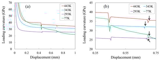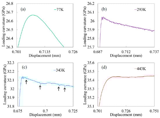 Figure 8 shows an enlarged view of the region of the curve that is indicated by the arrow in Figure 7b as a means to investigate the details of the loading curvature-displacement relationship. Serrations were observed at 293 and 343 K but not at 77 and 443 K. The effective strain rate was approximately 7 × 10−4 s−1 at all testing temperatures (see Figure 6). It has been stated that the serrations observed in uniaxial tests were affected by the strain rate and the testing temperature. To discuss the effect of testing temperature on the serration behavior observed in this study, the testing temperatures related to indentation were investigated.