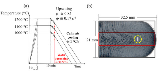 (a) Thermomechanical routes. tsmin, minimum soaking time. (b) Half-section macrograph of the forged sample. The red rectangle indicates the analyzed area. The yellow circle labeled 1 indicates the position from where the micrographs shown in this work were taken.