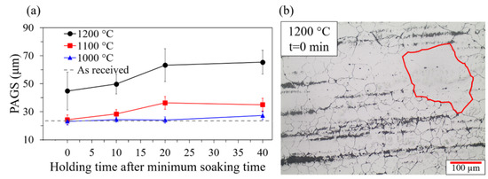 Figure 3a shows the evolution of PAGS as a function of temperature and time. PAGS of the as-received material (indicated as the gray dashed line), was found to be 24 µm. At 1000 °C, a slight growth was observed at 40 min of holding time (≈4 µm) in comparison to the initial grain size. At 1100 °C, no growth was noticed at time t = 0 min and 10 min. A sharper growth was observed at 20 min, followed by a stabilization of the grain size at t = 40 min. At 1200 °C and t = 0 min, the grain showed an increase of ≈20 µm with the highest growth between 10 and 20 min and a stabilization of the grain size at 40 min, similar to 1100 °C. However, at 1200 °C, PAGS had a significant data dispersion (indicated by the error bars). This dispersion happened because larger grains than those of the matrix are present in the microstructure, as indicated in highlighted in red in Figure 3b.