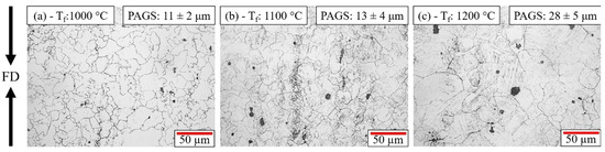 Optical microscopy of the PAGS after hot deformation with 60% of reduction at (a) 1000 °C; (b) 1100 °C; and (c) 1000 °C Tf, forging temperature; FD, forging direction.