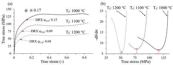 Figure 5a shows the flow stress curves from the hot forging experiments indicating the critical strain for the onset of DRX, while Figure 5b shows the versus , where the minimum values correspond to the critical stress for the beginning of DRX.