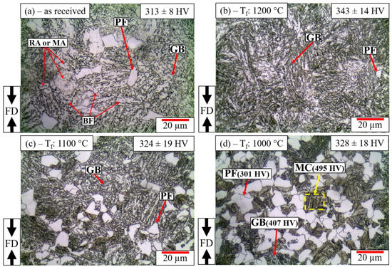 Optical microscopy of (a) as-received condition and forged samples cooled in calm air: (b) forged at 1200 °C; (c) forged at 1100 °C; and (d) forged at 1000 °C. PF, polygonal ferrite; GB, granular bainite; MC, third microconstituent; RA, retained austenite; MA, martensite/austenite; BF, bainitic Ferrite; FD, forging direction.