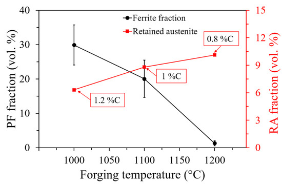 The effect of the forging temperature on the PF and RA fractions and carbon content of the austenite.