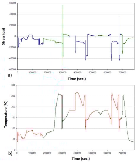 Figure 7 shows the evolution of temperature and one stress component during the second sequence of transients. Beyond the different durations of the transients (which directly affect the strain rate and, thus, the
