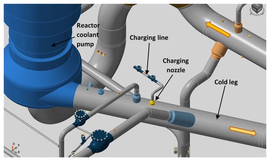 Figure 3 presents a scheme of the system, with the charging line, the charging nozzle, and the cold leg of the reactor coolant system (RCS), which are some of the components involved.