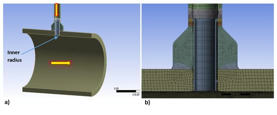 Figure 4 shows a scheme of the charging nozzle and the inner radius location at which the EFA was performed, together with the FEA model used in the stress calculation. The nozzle connects the charging line of the chemical and volume control system (CVCS) with the cold leg of the reactor coolant system (RCS) of the PWR plant. The cold leg had an inner diameter of 698.5 mm (27.5 inch) and an outer diameter of 816.34 mm (22.86 inch), whereas the inner and outer diameters of the nozzle were 66.65 mm (2.624 inch) and 88.9 mm (3.5 inch), respectively. The cold leg was made of stainless steel SA-351 Gr. CF8A and the charging nozzle was made of stainless steel SA-376 TP316, following ASME specifications.