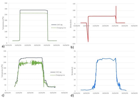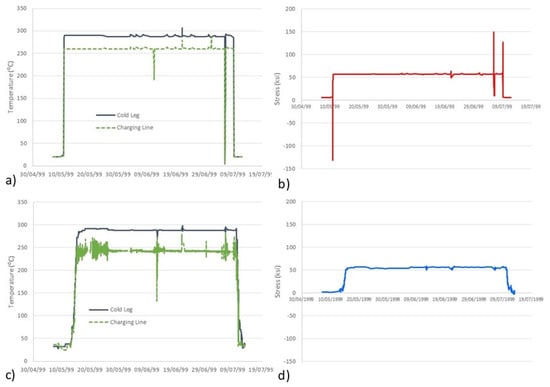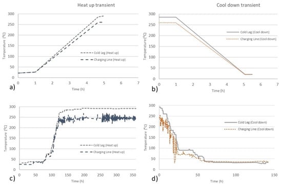 Figure 5 shows a comparison of the design and real (in-plant) transients (heat-up and cool-down). It can be observed that real transients have a longer duration than design transients: design transients usually take 5 h, while real heat-ups may take up to 3 days and cool-downs may take up to 2 days for the NPP concerned here.