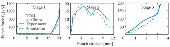 Figure 2 depicts numerical and experimental process forces of the individual stages. The comparison shows a good agreement between simulation and experiments. The differences in force curves can be attributed to process influences such as gas spring forces, tool stiffness, as well as varying sheet thickness. The press speed is kept constant at 10 mm/s for every process stage.