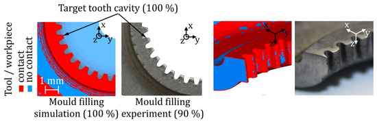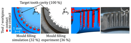 Mould filling of the experimentally formed gears was determined with the measuring microscope VR3200 by the company Keyence (Osaka, Japan). The proportion of numerical mould filling was determined by a measurement in material flow simulation. In comparison, mould filling of the tooth cavity reached about 36% after the second stage in the experiment. FE simulations depict similar results according to Figure 3.