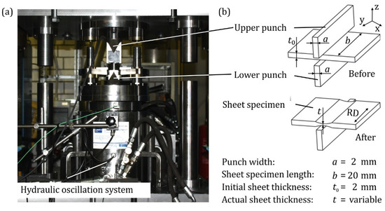 The sheet specimens are cut out of a 2 mm thick mild steel DC04 by water jet cutting. Figure 5b depicts a specimen before and after the plane strain compression test. The upper and lower dies are made of high-speed steel (1.3343). The oscillating and non-oscillating experiments are carried out at room temperature, and the upset speed is kept constant at 1 mm/s. All tests are carried out with a frequency of 200 Hz and an amplitude of 20 µm without lubricant to keep the boundary conditions constant.