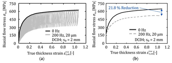 Here, F is the experimental compression force and m is the friction factor between the punch and sheet specimen. The geometrical parameters can be taken from Figure 5b. Since the experimental force F already includes the friction term, the friction factor has been eliminated from Equation (1). Figure 6 depicts the biaxial true stress–true strain curves of oscillating and non-oscillating plane strain compression tests. According to Figure 6, the maximum biaxial flow stress of the superimposed oscillating and non-oscillating processes is identical. The biaxial flow stress is reduced by up to 21.8% under superimposed oscillation. The dashed line in Figure 6 right represents the average flow stress of all experiments carried out under superimposed oscillation.
