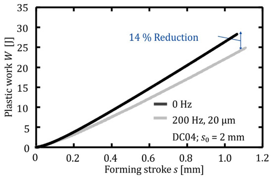 Taking the experimental force profile F and the end of the forming stroke s, the plastic work of the plane strain compression test is 28 J. The comparison of the plane strain compression tests shows that superimposed oscillation with an excitation frequency of 200 Hz and an excitation amplitude of 20 µm reduces the total plastic work by up to 14% according to Figure 7.