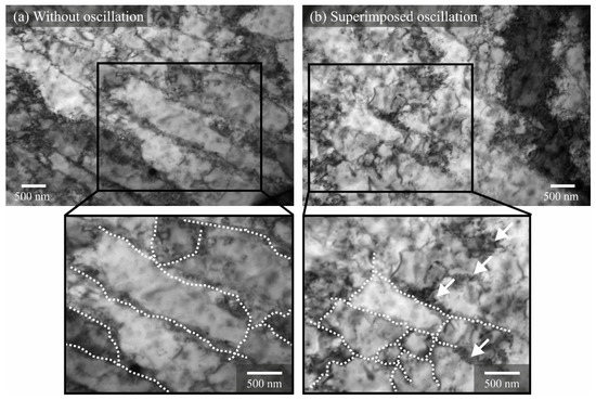 These dislocation networks are less strongly pronounced under superimposed oscillation; respectively, the cell walls are more diffuse, as shown in the detailed view (Figure 8b arrows). Superimposed oscillation appears to lead to smaller dislocation cells, a smaller dislocation density at the cell walls, and an increase in dislocations in the cell centre; see Figure 8.