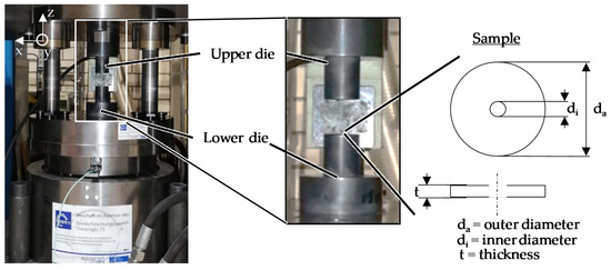 - Koch, S.; Vucetic, M.; Hübner, S.; Bouguecha, A.; Behrens, B.A. Superimposed oscillating and non-oscillating ring compression tests for sheet-bulk metal forming technology. Appl. Mech. Mater. 2015, 794, 89–96. [Google Scholar] [CrossRef]