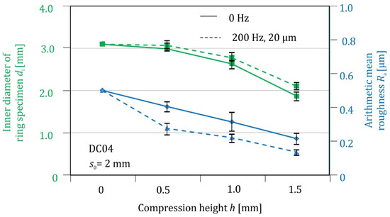 For the implementation of superimposed ring compression tests, the tool system for plane strain compression tests is adjusted by Koch et al. [16]. The ring specimens were cut out of a 2 mm thick mild DC04 sheet blank by water jet cutting and have a ratio of 6:3:2 between the external diameter, internal diameter, and height. The superimposed oscillating ring compression tests are carried out with an excitation frequency of 200 Hz and an excitation amplitude of 20 µm. To investigate the friction conditions between ring specimen and tools, the inner diameter of the ring specimen is measured after the ring compression tests. By means of this method, the friction coefficient can be determined, which increases with decreasing inner diameter. The analysis of the specimens shows that after superimposed oscillating tests, the inner diameter of the ring specimens is smaller than after non-oscillating ring tests. Based on the results, it can be stated that superimposed oscillation reduces the friction between specimen and tool. The friction factor m was calculated according to Avitzur and Cockcroft and showed a reduction from 0.34 to 0.29 under superimposed oscillation [9]. This effect could be due to the permanent interruption of surface contact between the tools and ring specimen and the reduced surface roughness caused by superimposed oscillation. The roughness investigations of the upper and lower surface of the ring specimens show that the arithmetic mean roughness Ra of the specimen surface is lower when using superimposed oscillation. This smoothing effect is observed by Koch et al. for all compressed ring specimens, regardless of their respective compression height [16]. The results of the arithmetic mean roughness Ra of the ring specimens as well as their inner diameter are summarised in Figure 10 and show the interaction of both aforementioned effects.
