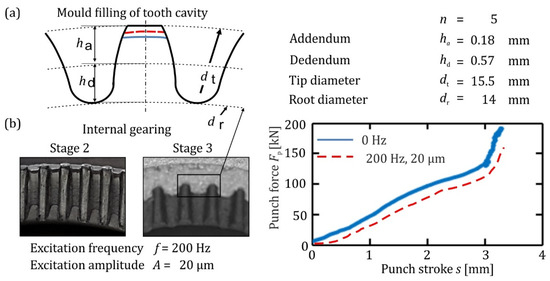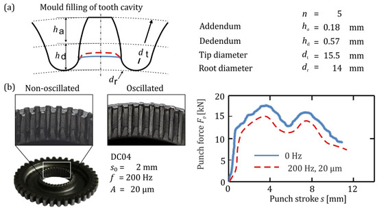 Consequently, an opportunity occurred to investigate the influence of superimposed oscillating on mould filling. Oscillations with an excitation amplitude of 20 µm and an excitation frequency of 200 Hz were introduced in the second forming stage under the same boundary conditions. The press speed is 10 mm/s for superimposed oscillated and oscillation-free experiments. As a result, mould filling of the tooth cavity has increased by up to 6%, as shown in Figure 11a. According to the force–stroke diagram in Figure 11b, the forming force is reduced by up to 14% during superimposed oscillating experiments compared to non-oscillating experiments. The reason for these effects should be the reduced friction caused by the permanent interruption of surface contact between tools and specimen. According to Figure 11b, optical inspection of the internal gearing shows that superimposed oscillation reduces burr formation on the upper side of the teeth.