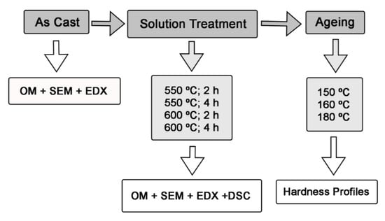 Outline of the experimental work carried out. OM: optical microscopy; DSC: differential scanning calorimetry; EDX: energy dispersive X-ray spectroscopy; SEM: scanning electron microscopy.