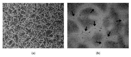 Microstructure in the as-cast state. (a) Dendritic segregation is observed; (b) β-Al5FeSi particles at the grain boundaries. The etching reagent consisted of a solution of 100 mL distilled water with 4 g KMnO4 and 1 g NaOH.