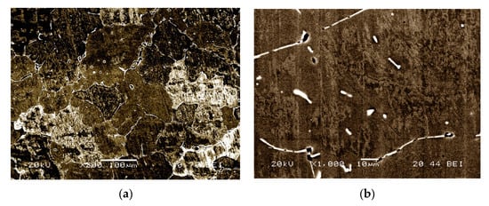 Figure 2 shows the microstructure obtained in the as-cast state. It can be seen that the microstructure presents dendritic segregation and precipitation of β-Al5FeSi particles in the segregated zones, preferably at the grain boundaries. Figure 3 shows images of this microstructure obtained using electron channelling contrast imaging (ECCI) [34]. The elongated, acicular morphology of the β-Al5FeSi particles can be observed, forming a more or less continuous network through the grain boundaries network of the α-Al phase. It can also be seen that the grain size is around 200–250 μm. Figure 4 shows the microstructure obtained following the solution treatments with cooling in water. A homogenized microstructure can be seen in all cases, with no dendritic segregation. A decrease in the volume fraction of AlFeSi particles and loss of their continuity were likewise observed. Figure 5 shows the transformation of the microstructure during the homogenization treatment. Figure 5a shows the microstructure obtained in the as-cast state. The β-Al5FeSi particles and the Mg2Si phase can be observed, both located at a grain boundary. Figure 5b shows the microstructure after solubilization at 600 °C, employing cooling in water. This treatment also allows the solubilization of the Mg2Si phase and the transformation of the β-Al5FeSi particles into α-Al8(FeMn)2Si particles. Cooling in water prevented solid-state precipitation of Mg2Si.