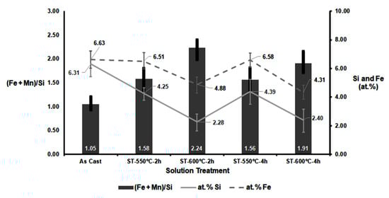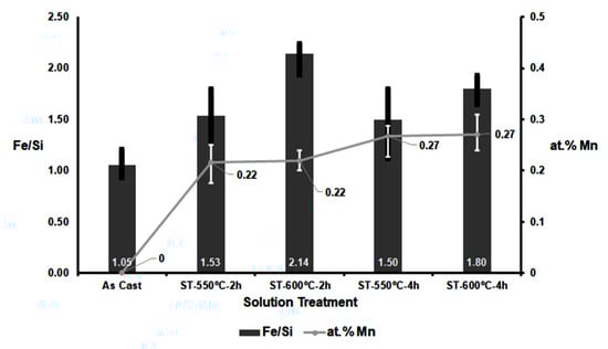 Figure 6 shows the Fe/Si atomic ratio and the atomic percentage of Mn in the α-Al(FeMn)Si particles, while Figure 7 shows the (Fe + Mn)/Si ratio, along with the atomic percentages of Si and Fe. It can be observed that the Fe/Si ratio was higher in treatments at 600 °C than in treatments at 550 °C, a finding that could be justified by the greater dissolution of Si atoms at 600 °C. This would allow an increase in the potential for structural hardening. However, this ratio decreased when the duration of the treatment was 4 h. Note that the atomic % of Fe in the α particles was much lower in the treatments at 600 °C, being lower with dwell times of 4 h versus 2 h. Moreover, the β-AlFeSi particles in the as-cast state do not contain Mn atoms. However, as the dwell times of the treatment temperature increased, the atomic content of Mn in the α-Al(FeMn)Si particles also increased.