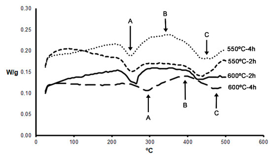 Figure 8 shows the results obtained after the DSC analysis. Two main exothermic peaks were detected, designated as A and C. Peak A corresponds to precipitation of the β”and β’ phases. In between peaks A and C is the endothermic peak B that corresponds to the dissolution of these phases. Lastly, peak C corresponds to the precipitation of the β phase [35,36,37,38,39,40,41,42]. The endothermic peak prior to the exothermic peak A shows the dissolution of the GP zones formed during natural ageing. The results of the DSC test provide the temperatures at which the structural hardening precipitations are verifiable when this temperature is reached by means of a heating ramp. In our case, the heating rate is 10 °C/ min. This means that these temperatures cannot be compared with the isothermal ageing temperatures, the latter being necessarily lower. However, when the aim is to compare various ageing treatments, this test allows us to compare whether the structural hardening will occur sooner or later. The solution treatment at 600 °C with a dwell time of 4 h produced the greatest delay in the formation of the metastable transition phases (Peak A) and their subsequent dissolution (Peak B). This delay could be related to the dissolution of the Fe atoms that were observed in the previous solution treatment at this temperature with prolonged dwell times, which could be grounds for further investigation in this regard.