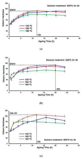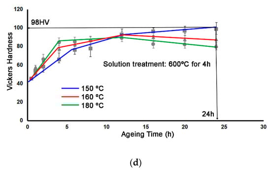 Figure 9 shows the hardness profiles obtained after the ageing treatments. The peak hardness values were obtained with solution treatments at 600 °C, which are the ones that dissolved the highest % Si from the β-AlFeSi particles. This would allow more Si to be available in solid solution for the subsequent precipitation of the metastable β” phase during ageing. The peak hardness value was 104 HV after the solution treatment at 600 °C for 2 h and ageing at 160 °C for 12 h. Very similar hardness profiles following the solution treatment at 550 °C were obtained with dwell times of 2 and 4 h. However, the peak hardness values obtained after a dwell time of 4 h at 600 °C were delayed in the three ageing temperatures compared to the 2 h dwell time. This fact may be conditioned by the dissolution of Fe atoms observed after the 4 h dwell time at 600 °C.
