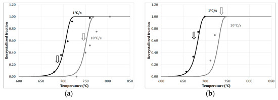 The results of the model are compared with the recrystallization kinetics determined during the continuous heating at different rates in Figure 2a,b and isothermal annealing at different temperatures in Figure 2e,f for both steels, A and B. The previous equations were solved explicitly. The integration time step was chosen to provide a result insensitive to the step size (integration step time = 0.5 s). The calculations are in that sense CPU efficient and can be performed using a very basic solver (calculation time <1 s for any thermal treatment with the considered step time). The calibration procedure leads to an excellent agreement between the experimental and calculated results with a single set of adjustable parameters. Only the mobility equation (MHAB) has to be adapted for each steel.