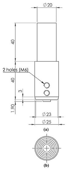 The friction stir diffusion cladding (FSDC) tool (a) side view, (b) bottom view of tool shoulder, showing the grooves to enhance material’s flow during cladding. (All dimensions are in mm).