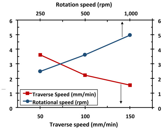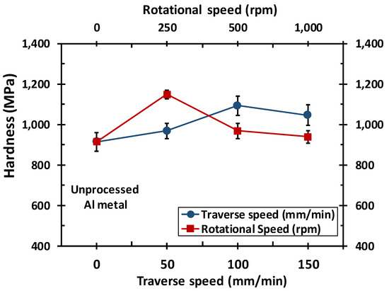 The hardness of the cladded system measured with the microindentation from the processed top surface is shown in Figure 6. The load versus the penetration depth curves are provided in the supplementary data file (Figure S3). As the rotation speed increased from 250 to 500 to 1000 rpm, the hardness increased from 915 MPa for the unprocessed Al cladding material by 26%, 6%, and 3%, respectively. The relatively lower hardness at higher rotation speed can be attributed to crystallite growth due to higher heat input. Similarly, the hardness increased slightly by 6%, 20%, and 15% when the traverse speed was increased to 50, 100, and 150, respectively. The hardness trend agrees well with the crystallite size presented in Figure 5. The Al 5052 alloy is non-heat treatable and is hardened by the cold-work process. Thermal stabilization treatment is usually used to stabilize the gained hardness and to avoid time-dependent age softening [22]. Annealing of 5052 Aluminum alloy is achieved by uniformly increasing the temperature of the workpiece to 345 °C [23]. In the FSDC process, similar to FSW, the processed material temperature is expected to reach 80% of the solidus temperature, which is above the annealing temperature. Therefore, partial annealing can be expected, i.e., softening of the processed material. Besides the crystallite growth phenomenon, this is another possible explanation for the drop in the hardness of samples that were processed at a higher rotation speed, where heat input was highest. Generally, the hardness of the friction stir processed surface is usually influenced by the recrystallization and heating cycle, among other phenomena.