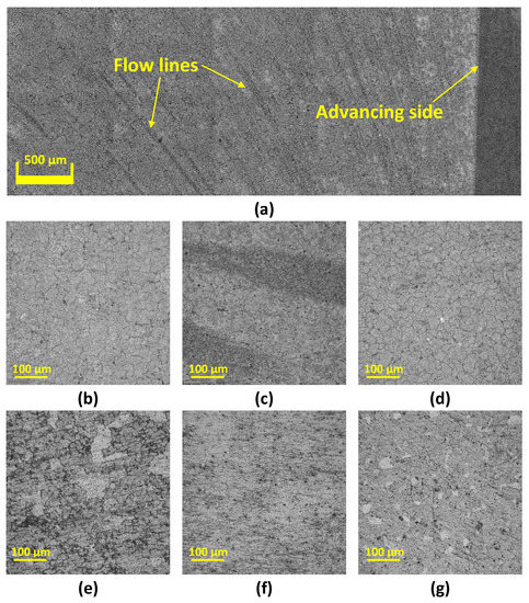 Optical microscope images (a) panoramic view of processed zone, (b) unprocessed Al metal, (c) FL-1, (d) FH-1, (e) FM-1, (f) FM-2, and (g) FM-3. Letters L, M and H represent 250, 500, and 1000 rpm, respectively. Digits 1, 2, and 3 designate 50, 100, and 150 mm/min, respectively).