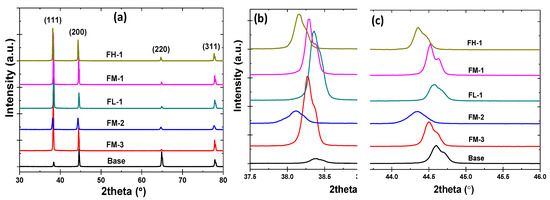 X-ray diffraction patterns: (a) all processed samples in comparison with base Al, (b) zoom in (111) plane, (c) zoom in (200) plane.