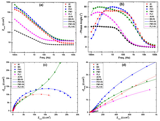 Figure 8 presents the EIS curves after 21 days of immersion for cladded samples FM-1, FM-2, and FM-3 in addition to bare steel and the unprocessed Al cladding material for comparison. Although, all cladded samples exhibited a higher impedance that was larger than bare steel, samples FM-2 and FM-3 demonstrated lower resistance in comparison to the unprocessed Al cladding material. Moreover, the impedance of sample FM-3 was just slightly higher than the impedance of the bare steel (Figure 8a). This indicates that the selected process parameters induced a negative influence on the corrosion resistance of the Al cladding material. This may also be associated with the reduced crystallite size of the samples processed at higher traverse speeds. The phase angle (Figure 8b) of FM-1 was the only sample with a larger phase angle than the cladding material and was close to 80°. The Nyquist plot (Figure 8c) also revealed a semicircle at high frequencies for the bare steel, FM-2, and FM-3 samples, while the large incomplete semicircle of sample FM-1 also further supports its superior resistance. By zooming in as in Figure 8d, it is clearly seen that the cladded samples FM-2 and FM-3 exhibited a lower resistance relative to the unprocessed Al cladding material. The results indicate the superiority of sample FM-1 over the other samples in terms of corrosion resistance including unprocessed cladding material. Besides the fact that grain refinement can influence the corrosion resistance for low-to-passive alloys, it may also affect the thermo-mechanical properties that may affect the corrosion resistance. These include but are not limited to developed surface roughness, segregation of alloying elements, porosity (defects), and/or internal stresses [25]. It should be noted that the corrosion test was performed on the unprocessed Al metal to serve as a measure of deviation due to the FSDC processing. However, they are not practically comparable, as the corrosion of the cladded system with processed Al top surface and steel being the substrate cannot be likened to that of a freestanding unprocessed Al metal.