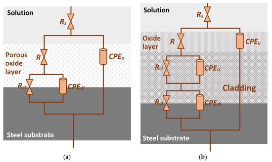 Equivalent circuits used for fitting the EIS data of the (a) bare steel and (b) cladded samples after 21-day immersion.