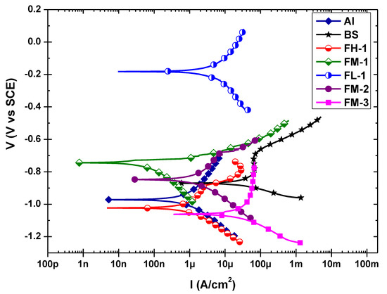Potential dynamic polarization (PDP) was performed after 21 days of immersion in the saline medium, and the results are shown in Figure 10. The data extracted from the PDP curves are also listed in Table 5. Based on the Icorr obtained from the PDP test, the FSDC-processed-sample efficiency (Epdp) was estimated using Equation (4).