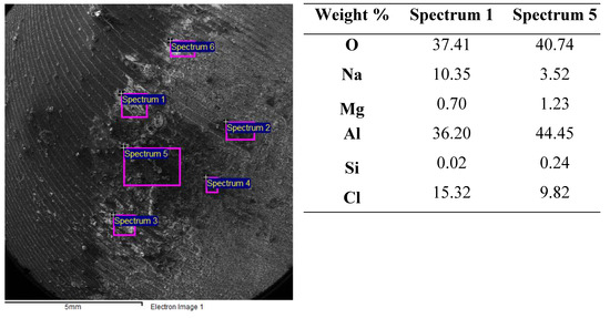 After completing the corrosion tests, the corroded surfaces of the cladded samples, as well as unprocessed cladding material were examined using SEM, and the corrosion products were also analyzed using EDS analyses. The low magnification SEM images showing the exposed area to the medium are provided in Figure S4 (supplementary data). The ranks of the corrosion protection performance of all samples obtained from the EIS analysis, PDP, and visual inspection of the corroded surfaces were found to be in good agreement. Figure 11 presents the SEM images of the exposed areas. Besides the unprocessed Al (Figure 11a), significant accumulation of corrosion products can be observed on the samples with samples FL-1 (Figure 11c) and FM-3 (Figure 11f) exhibiting improved passivation behavior. Figure 12 presents the EDS results of the corroded sample FL-1. It can be inferred from the results that the corrosion products are possible mixtures of oxides of Al, Mg, or combination and NaCl deposits. The formation of the corrosion product can hinder further corrosion of the underlying metal when the formed oxides are well dispersed, compact, and firmly adherent oxides. This is indicated by the almost vertical anodic curve (better passive region stability) of sample FM-3 as well as sample FL-1 after being anodically polarized to higher potentials.