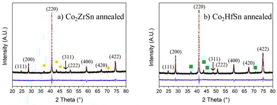 As reported in Table 1, the Rietveld analysis allowed quantifying the amount of secondary phases in the samples, which is 12% for Co2Zr (2) and 7% for Co2Hf (5). Concerning phase 3 (CoSn), its abundance is too small to be calculated with the Rietveld refinement (so its quantity will be considered negligible). The relative amount of the secondary phases does not change after annealing; however, slight changes of the EDS phase composition and lattice parameters can be observed. The lattice parameters found for the as-cast alloys are 6.2338 Å and 6.2101 Å for Co2ZrSn and Co2HfSn, respectively. After annealing, the values of the lattice parameters become 6.2458 Å for Co2ZrSn and 6.2157 Å for Co2HfSn, which are very close to the equilibrium values reported by Ziebeck et al. [] (i.e., 6.249 Å and 6.218 Å for Co2ZrSn and Co2HfSn, respectively).